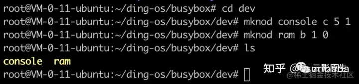 - 然后在 dev 目录下创建 console 字符设备,主设备号是 5,次设备号是 1。之后再创建一个 ram 块儿设备,主设备号是 1,次设备号是 0。