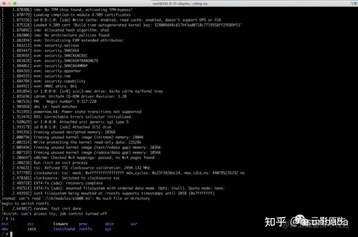 这个脚本主要作用就是开启 hotplug 热插拔机制(echo 的 mdev 是 busybox 提供的一个工具,它可以在系统启东时候自动帮忙创建一些设备节点,比如启动之后 /dev 下的那堆 tty 设备文件)。然后将 /dev/sda 也就是系统检测到的第一块儿硬盘挂载到 /rootfs 下。随后插入 e1000 这块儿网卡设备的驱动。最后通过 switch_root 将根文件系统切换到真正的 /rootfs 并执行其下的 init 脚本。
