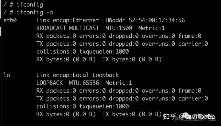 此时在 qemu 里 ifconfig 看不到任何东西,但是 ifconfig -a 可以看到 lo 和 eth0