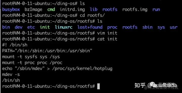 - 需要注意的是此时 rootfs 下也会有个 init 脚本,不过不同的是这个 init 已经是真是的 rootfs 可以执行的 init 了,因此一些在 initrd.img(也就是 busybox 文件) 中的 init 的一些命令已经不需要执行了,所以将 rootfs 目录下的 init 稍作修改