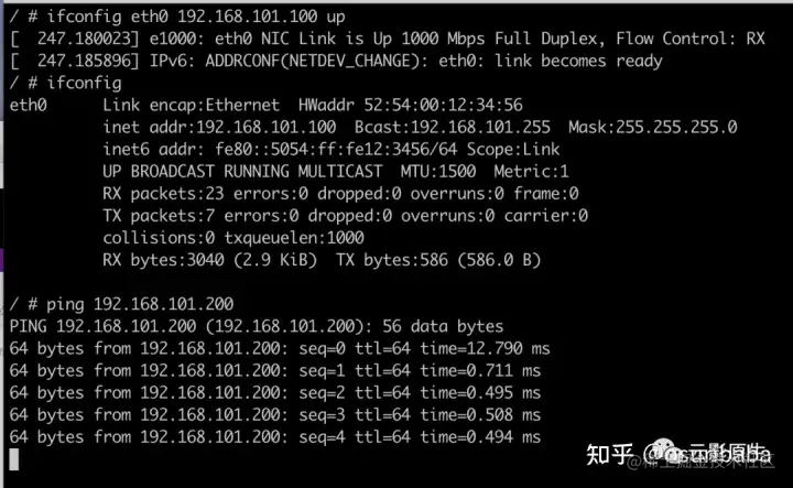 那这个 e1000.ko 是什么时候插入到内核的呢?其实在上面创建 busybox/init 脚本的时候,有一句是“insmod /lib/e1000.ko”,就是它来 insert 这个 e1000.ko 的。