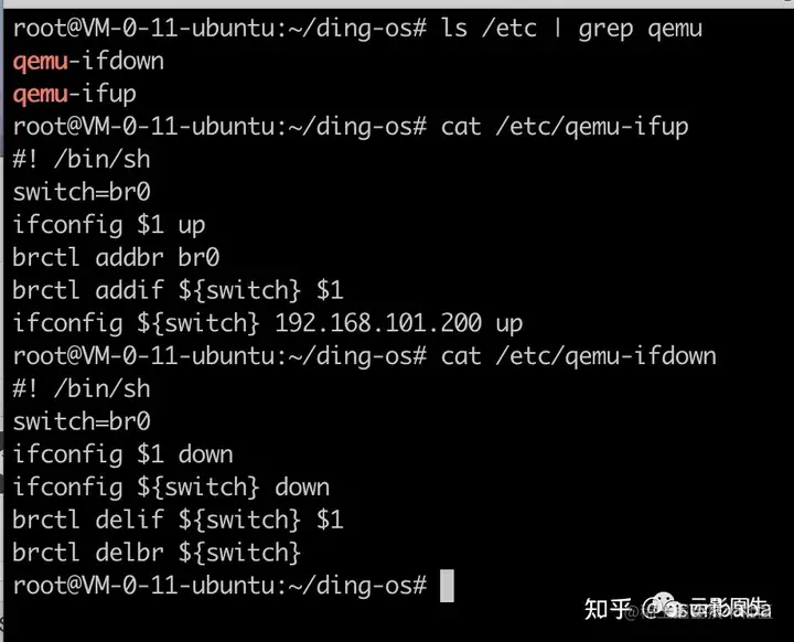 ifup 文件的作用就是在物理主机上启动一个叫做 br0 的网桥,并把虚拟的 tap 设备绑定到这个 br0 网桥上,并把 br0 网桥给 up 起来,这样由于在 cmd 中也指定了 qemu 启动后要依赖的网络设备是 tap0,所以此时 qemu 就能和物理主机进行通信了