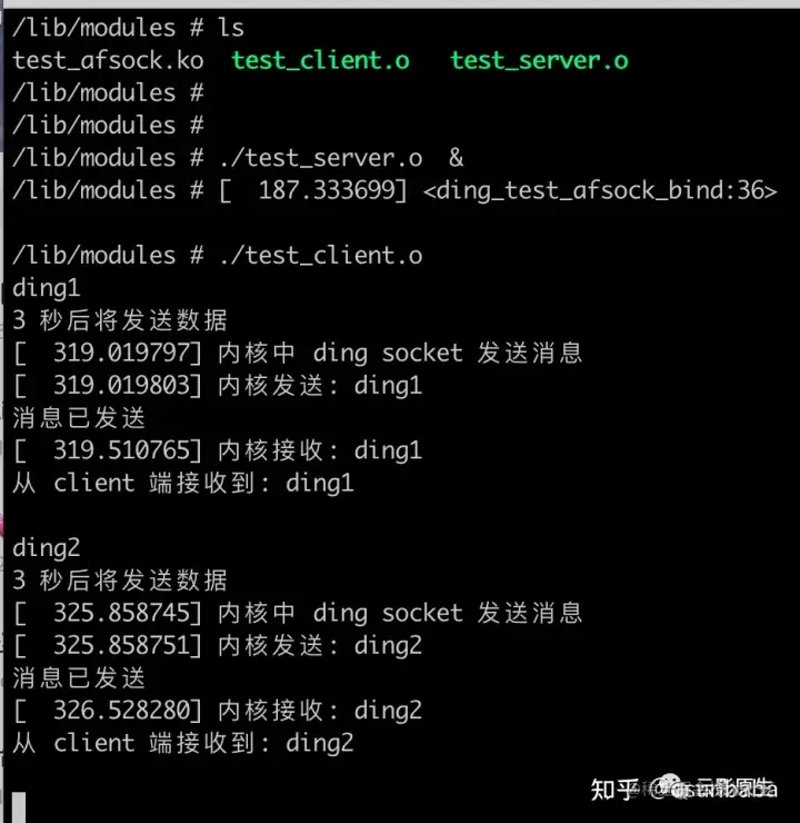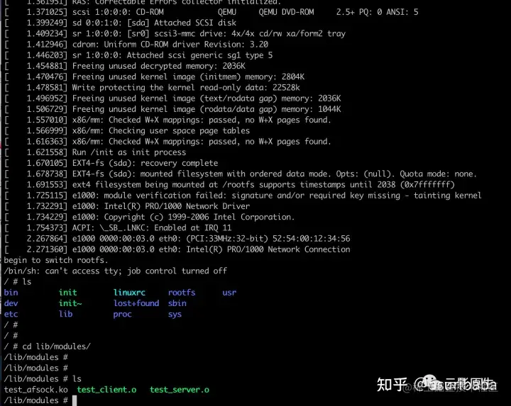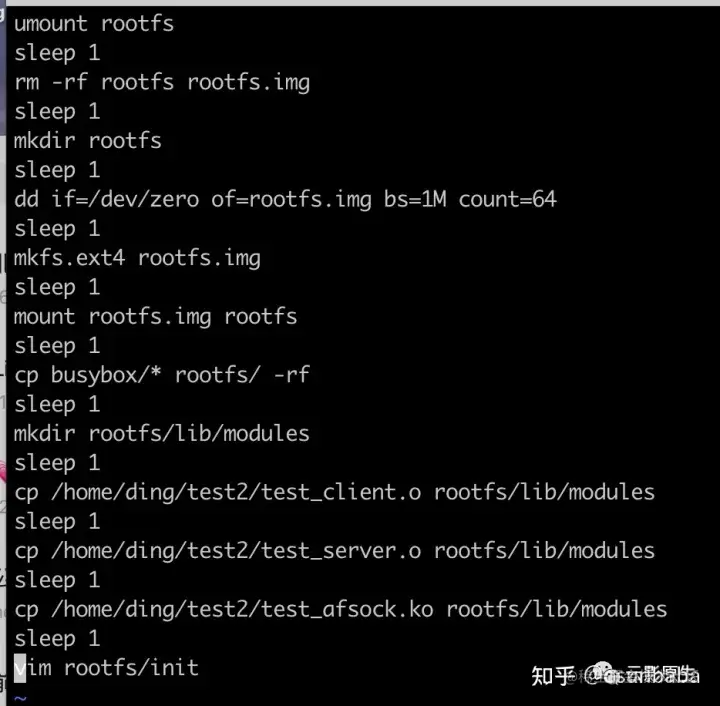 其中上面几步都和那篇 《编译一个最小 Linux 系统》(zhuanlan.zhihu.com/p/424240082… cp 命令。一定要把刚才编译完的 test_afsock.ko 以及 test_client.o 还有 test_server.o 拷贝到这个 qemu 启动的 Linux 系统的 rootfs 根文件系统中。