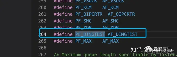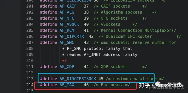 大概在低两百一十多行的位置,有个 AF_MAX,这个就是内核写死的支持的最多的协议簇的数量,这里原本是 45,我们为了实现自己的协议簇,就需要修改这个,我们给它改成 46,并在上头随便加个什么自己起名的协议簇名字,我这里叫 AF_DINGTESTSOCK,对应的数字是 45 号,没别的含义,就是随便起。