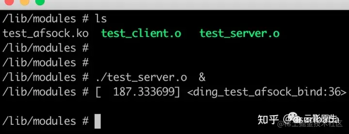编译完能看到产生了这么一大坨的文件,其中我们会用到 test_afsock.ko 和 test_client.o 以及 test_server.o
