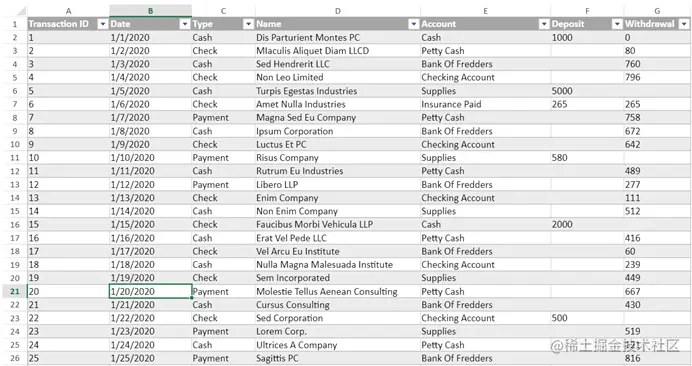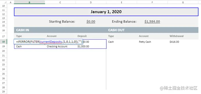- 结束余额(起始余额 + 当前存款的总和 - 当前提款的总和):=IFERROR(D13+(SUM(FILTER(tblTransactions[Deposit],tblTransactions[Date]=11))-SUM(FILTER(tblTransactions[Withdrawal] ,tblTransactions[日期]=11))),0)