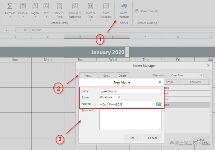 我们为包含所选日期、存款和取款的单元格指定一个名称,以便进行计算,此表格将包含所有交易数据。 为 currentMonth 创建名称范围的步骤是: