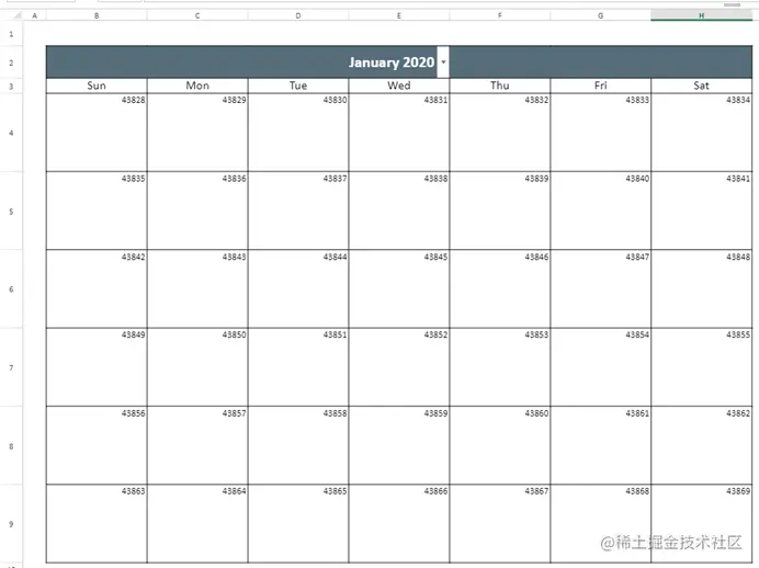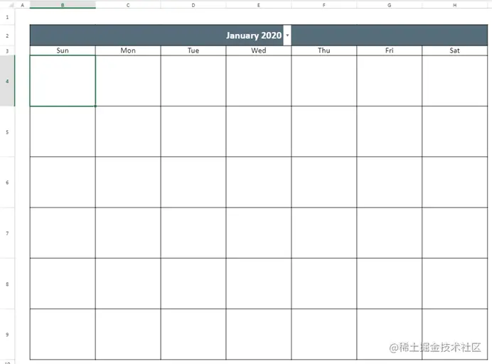 第 1 步:添加 MonthPicker 元素 我们日历的第一个元素是可变月份元素。要添加它,请使用 MonthPicker,这是 SpreadJS 中的一种下拉单元格样式。