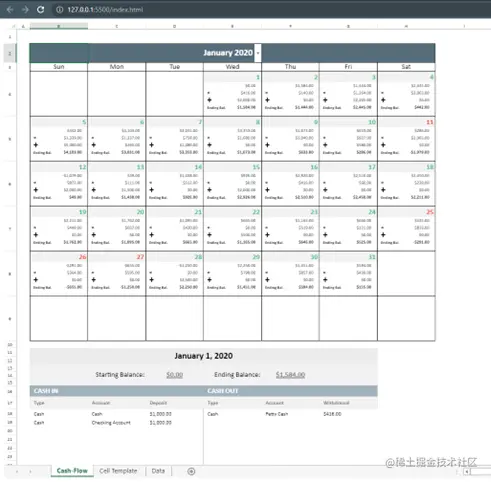 现金流量表(Cash Flow Statement),是指反映企业在一定会计期间现金和现金等价物流入和流出的报表。现金流量表是企业财务报表的三个基本报告之一(另外两个是资产负债表和损益表)。 为了全面系统地揭示企业一定时期的财务状况、经营成果和现金流量,财务报表需按财政部会计准则的标准格式设计,因此,财务报表的典型特征是数据更新频繁、分析维度多、数据来源复杂,常规的报表工具很难同时满足上述所有需求 本博客将带大家了解如何使用类Excel 的 JavaScript 电子表格在前端创建现金流日历。此日历将广泛使用以下强大功能: