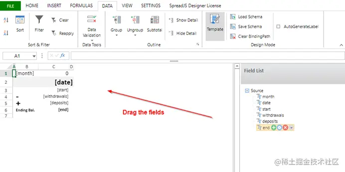 - 单击数据选项卡上的模板菜单 - 字段列表面板将出现在右侧