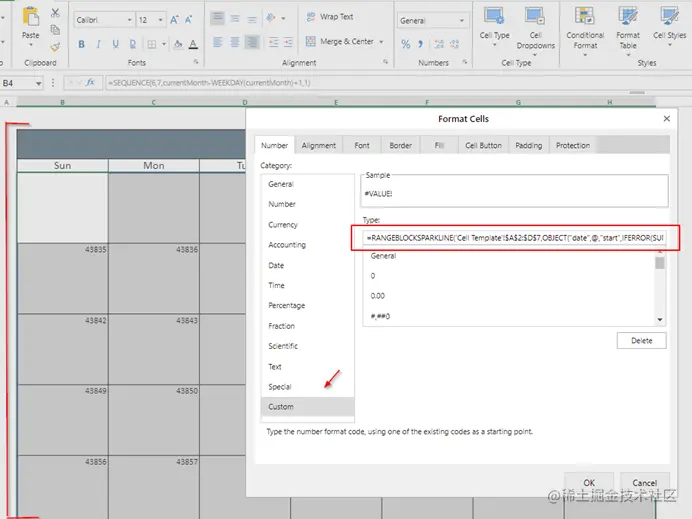 下面的步骤包括使用 RANGEBLOCKSPARKLINE,它将 TemplateSheet 中的单元格范围用作单个单元格类型,并使用 OBJECT 函数将模板应用于代表我们现金流日历中日期的所有单元格中。