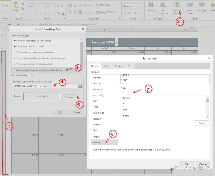 使用 SEQUENCE(rows,columns,start,step) 函数来分配我们日历中的日期。这允许我们稍后在 CellClick 上检索单元格值。 B4 单元格的公式为: