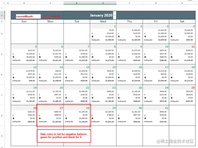 如上图所示,包含日历天数的单元格提供有关开始/结束余额、存款总额和提款总额的信息。