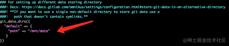 然后可能咱们还有一个需求,就是修改 gitlab 的存储路径,因为有些盘可能存储不够,需要切到存储余量大的路径,那么同样还是修改 /etc/gitlab/gitlab.rb,这里: