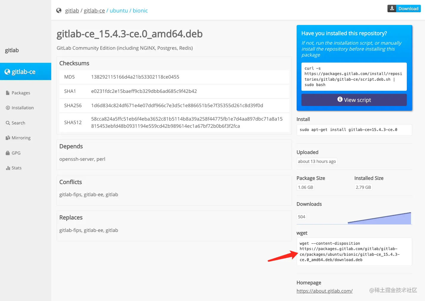 wget --content-disposition https://packages.gitlab.com/gitlab/gitlab-ce/packages/ubuntu/bionic/gitlab-ce_15.4.3-ce.0_amd64.deb/download.deb