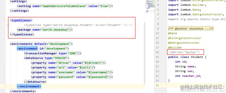 指定包名时,MyBatis 会在包名下面搜索需要的 Java Bean,在没有注解的情况下,会使用 Bean 的首字母小写的非限定类名来作为它的别名。若类上有注解@Alias,则别名为其注解值。