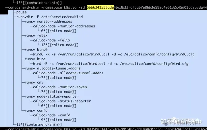 当我们使用 pstree 查看这个容器进程干了啥之后,可以发现首先启动了 pause 进程,然后就是通过 “bird6” 以及 “bird” 命令启动了 BIRD 进程,同时还运行了 felix 进程,这些都和我们上面介绍时说的一样。至于后面那些监控和上报状态相关的不是我们关心的重点,我们暂且先不论。