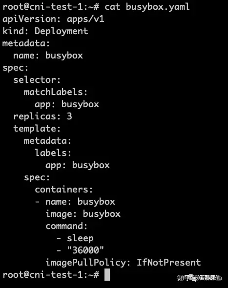 我这有个 busybox,里头跑仨副本。我们执行 “k apply -f busybox.yaml” 看下效果: