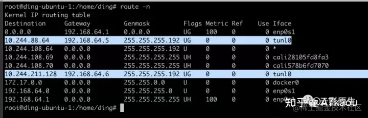 每台节点都执行完之后,如果你的配置文件没写错,启动命令也没写错的话,那大概率你的 Linux 路由表已经被配置了新的路由规则了,就像 calico 这样,会有一些出口 iface 是 tunl0 设备的规则: