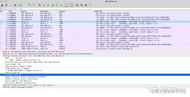 看图片中的抓包结果,可以明显看到这个报文中有两层的 ip header。这个报文最下面是 ping 程序的 icmp 报文,再往上一层的 ip header 是原始的 ip 报头,再再上的一层是在创建 ipip tunnel 设备时指定的一层 ip header,再再再往上的就是封装在外层的 mac 地址了。