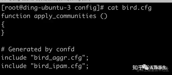 这里主要看后边的 “/etc/calico/confd/config/bird.cfg”,这个就是 Calico 运行 BIRD 最主要的配置文件,这个文件是真的在容器里了,我们得进去看: