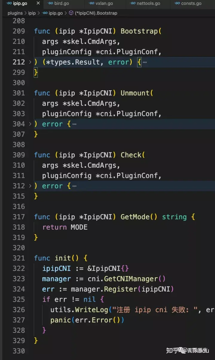 首先还是复用之前几个版本的代码,只需要在 plugin 目录下创建一个带有 Bootstrap、Umount、Check、GetMode 等方法的结构体,然后注册给 CNIManager 就行了: