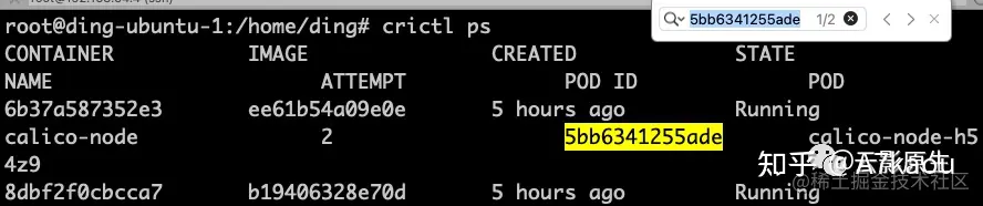 我们通过 crictl 工具来看一下容器的 ip。我这里因为 kubelet 使用的是 containerd,所以只能用 crictl 或者 ctr 命令行工具,如果你的是 docker 的话用 docker ps 也行: