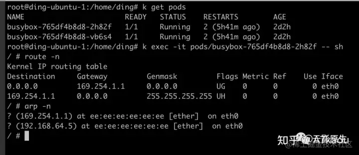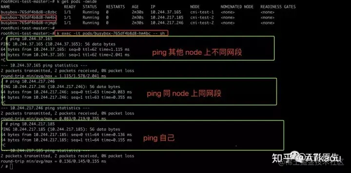 可以三个 busybox 已经都跑起来了。随后进入到其中一个 pod,尝试去 ping 其他节点上跨网段的 pod ip,ok!再尝试去 ping 自己的 ip,ok!最后尝试去 ping 同节点上其他 pod 的 ip,ok!