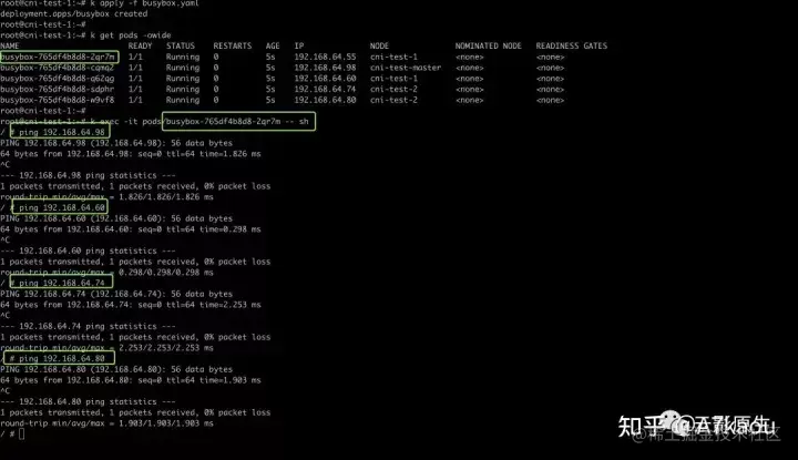可以看到,一共创建了 5 个 pod,其中 node1 上俩,node2 上俩,node3 上有一个。随便进到其中的某一个之后,分别去 ping 其他人,全部 ok~