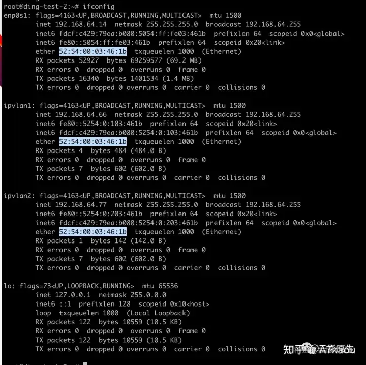 另外当你创建完 IPVlan 设备之后,会发现每个 IPVlan 设备的 MAC 地址和你的父网卡 MAC 地址是一样的: