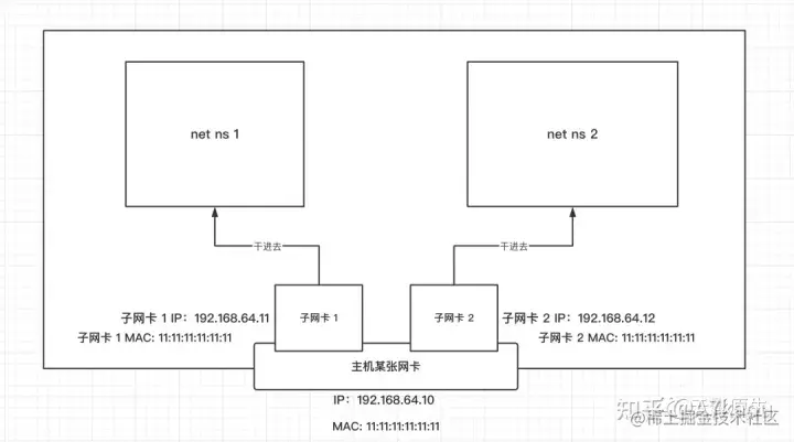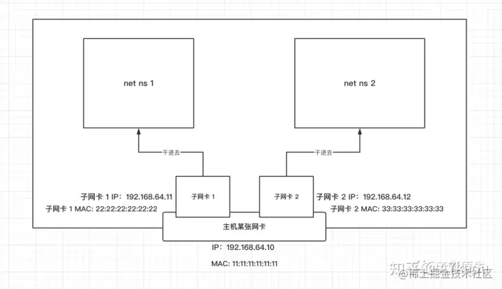 如图所示,它和上边 IPVlan 的区别在于每张网卡的 MAC 地址都是唯一的: