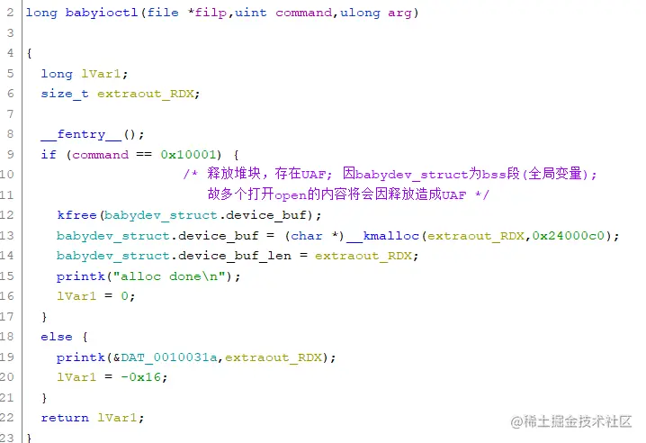 根据init文件内信息我们可以发现挂载了一个/lib/modules/4.4.72/babydriver.ko驱动,大胆猜测漏洞点位于其中(就是),位于long babyioctl(file *filp,uint command,ulong arg)函数之中,存在着UAF漏洞;
