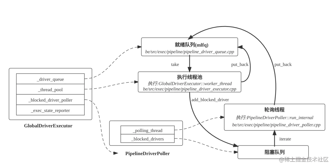 - PipelineDriverPoller::run_internal:阻塞 PipelineDriver 的轮询线程的函数,遍历阻塞 PipelineDriver,将已经解除阻塞的 PipelineDriver 放回就绪队列。