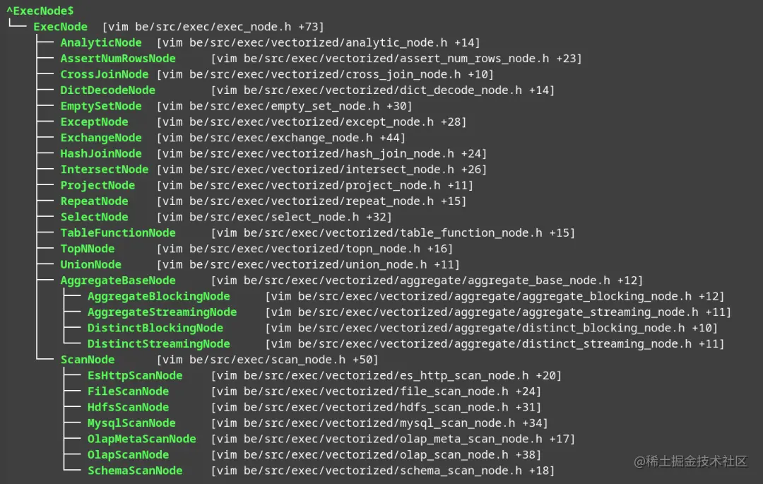 物理算子是 ExecNode 的子类,FE 投递给 BE 的 Fragment Instance 中,包含构成所属 PlanFragment 的物理算子, 物理算子如下图所示: