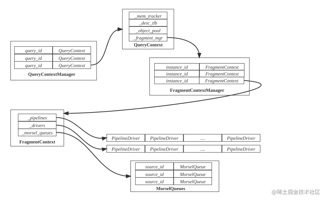 QueryContext 的生命周期比 FragmentContext 生命周期久,跨所有 Fragment Instance,属于 Query 层面的对象,可以由 QueryContext 管理。比如控制 Query 内存使用 MemTracker,所有 Fragment Instance 共享的 DescriptorTable。FragmentContext 只管理 Fragment Instance 范围的资源,主要包括 Pipelines、PipelineDrivers 和 MorselQueues。