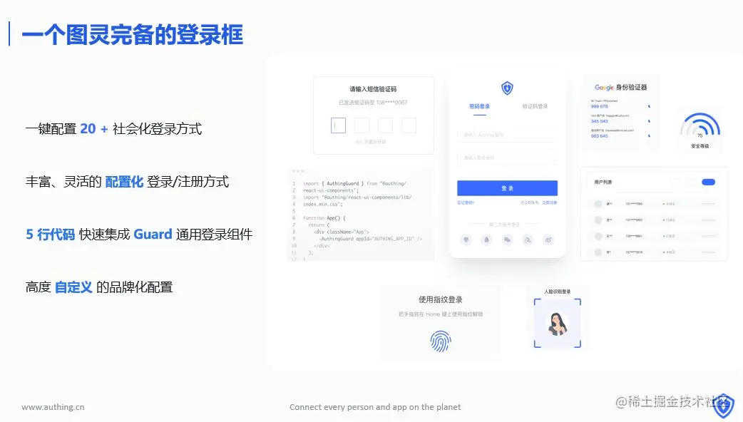 就像前文提到的,所有应用都离不开用户管理。以网易云音乐为例,用户管理模块包括:手机号、微信、QQ、微博等注册、登录方式,多端(Web 端、App 端、网页端)登录,以及服务协议的配置,忘记密码与找回账号等等相关功能。完成一个基础的账号注册登录功能就需要耗费一个前端工程师和一个后端工程师至少数周的开发时间。 开发完用户管理模块后,网易云音乐还需要开发会员体系、核心的音乐播放器、直播、社群业务等等,至少需要一个中型团队大半年时间。那么,有没有一套稳定安全的身份认证方案,可以让开发者免去开发身份基础设施的繁琐步骤,聚焦企业核心业务模块的开发?比如网易云音乐聚焦核心“音乐”功能,飞书聚焦核心“协作”功能,抖音聚焦核心“视频”功能等等。Authing 提供所有主流编程语言的 SDK,开放1000+ API,在 API 之上,我们提出了全新开发理念——Hyper Component。Authing 将登录框做成组件的形式,只需要5行代码即可快速集成 Guard 通用登录组件,一键配置20+社会化登录方式。只需几秒,即可完成身份系统搭建。另外,我们还提供了跨平台的组件化方案,支持 Web、iOS 和安卓端等多端无缝登录体验。