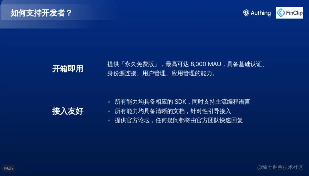 另外,秉承以开发者为中心的设计理念,2022 年,Authing 推出永久免费版,最高可达 8,000 MAU,具备基础认证、身份源连接、用户管理和应用管理能力。