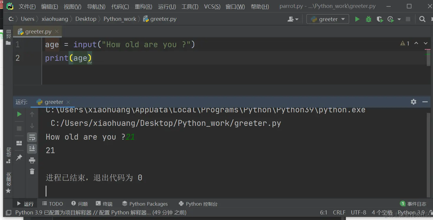 - 使用函数input()时,Python将用户输入解读为字符串。请看下面让用户输入年龄的解释器会话: