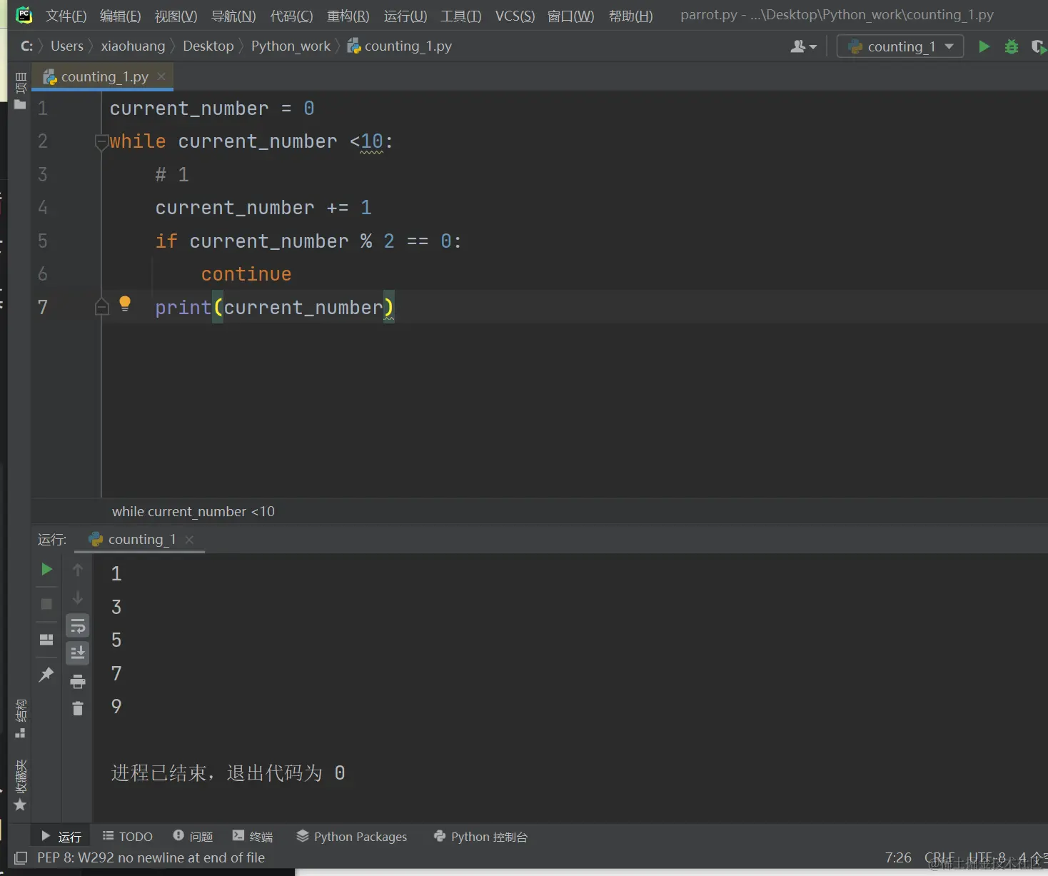 - 接下来,if语句检查current_number与2的求模运算结果。如果结果为0(意味着current_number可被2整除),就执行continue语句,让Python忽略余下的代码,并返回循环的开头。如果当前的数不能被2整除,就执行循环中余下的代码,将这个数打印出来: