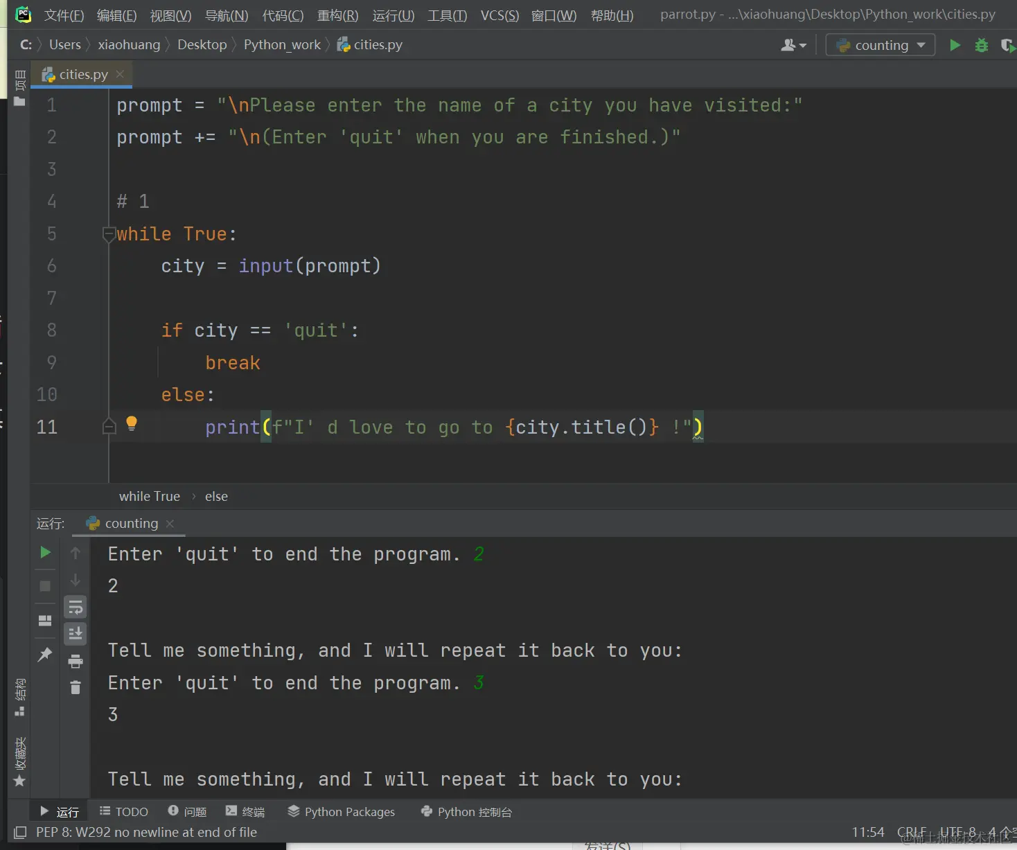 - 以while True(见❶)打头的循环将不断运行,直到遇到break语句。这个程序中的循环不断让用户输入他到过的城市的名字,直到用户输入'quit'为止。用户输入'quit'后,将执行break语句,导致Python退出循环