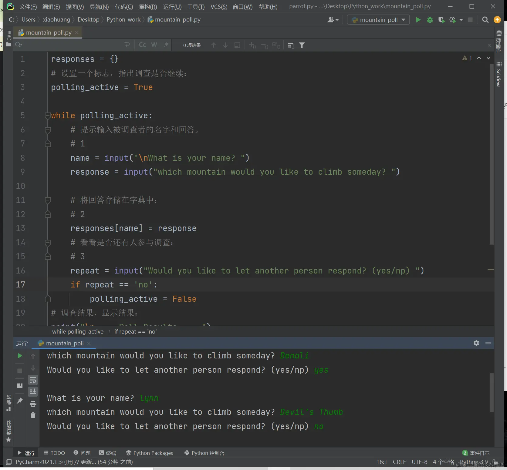 - 下面创建一个调查程序,其中的循环每次执行时都提示输入被调查者的名字和回答。我们将收集的数据存储在一个字典中,以便将回答同被调查者关联起来: