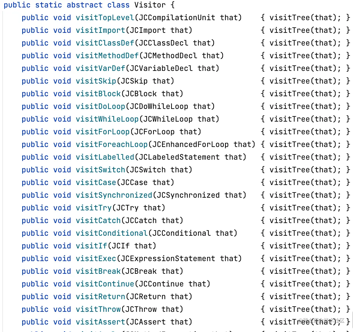 TreeTranslator.java 继承自JCTree.Vistor类,可以访问所有语法树节点,并对其进行代码侵入