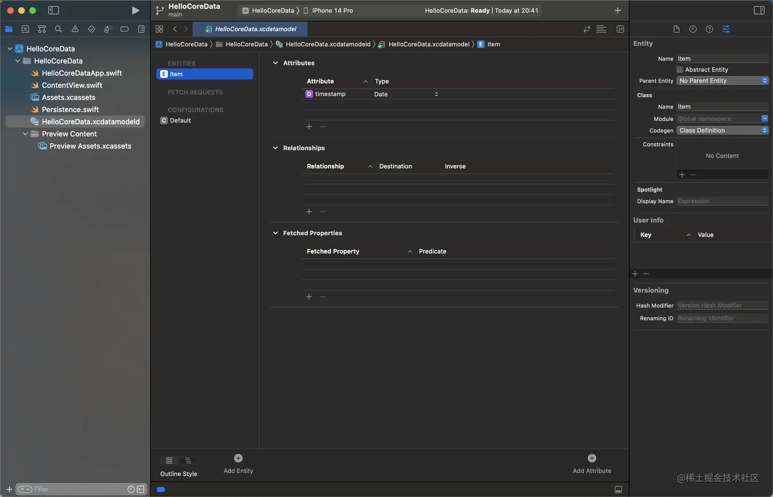 打开项目的 HelloCoreData.xcdatamodeld 文件,可以看到已经默认创建了一个名为 Item 的实体。