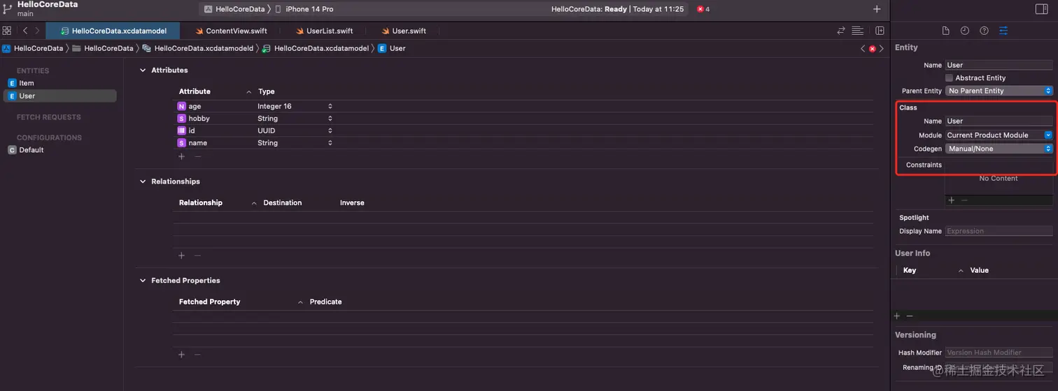 创建完实体后,我们还需要创建一个实体对应的模型,Xcode 也提供了自动生成实体模型的功能,但这里我们采用手动创建实体的方式。