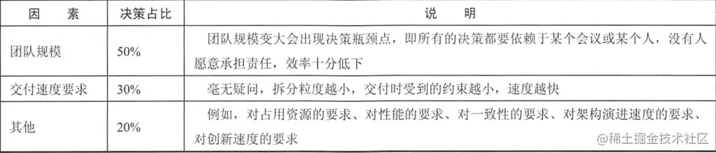 每个人情况不一样,有的公司认为团队规模是决定性的,有的认为交付速度是决定性的,找到你的决定性因素,来做拆分即可。实在找不到合适的依据,可以参考此表。