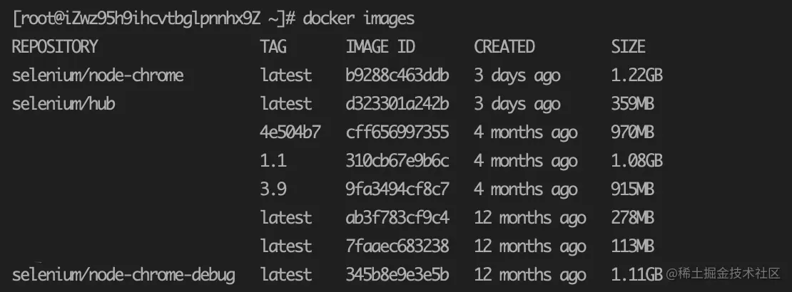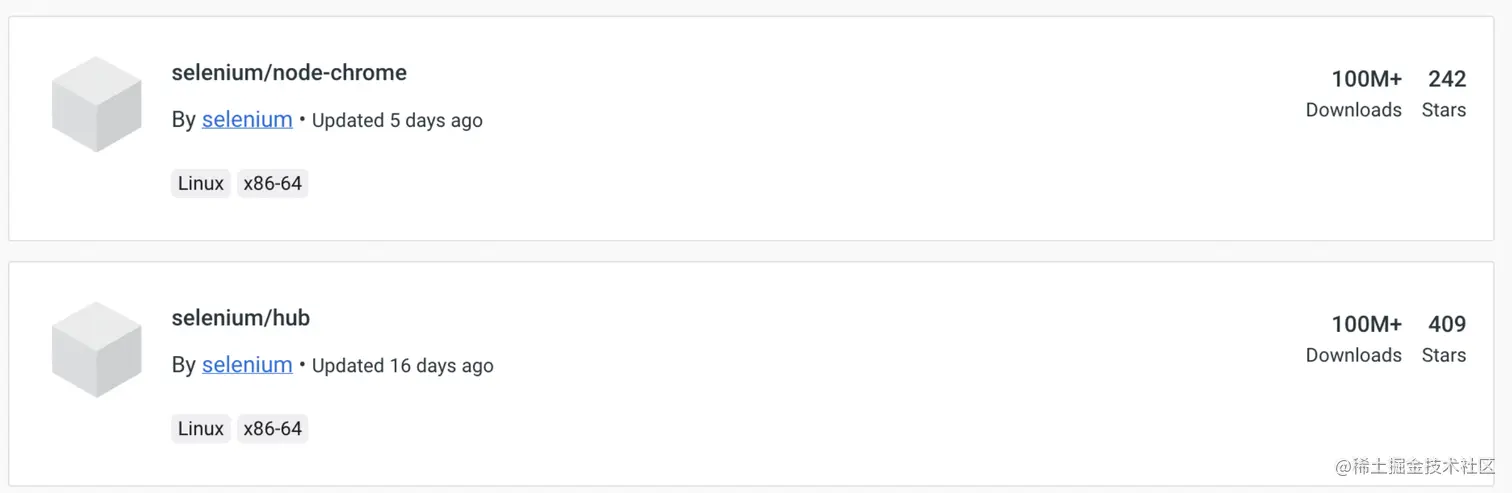 selenium就可以看到相关的镜像。我们主要用到这两个镜像,一个是hub服务,一个是包含chrome浏览器的Node节点。