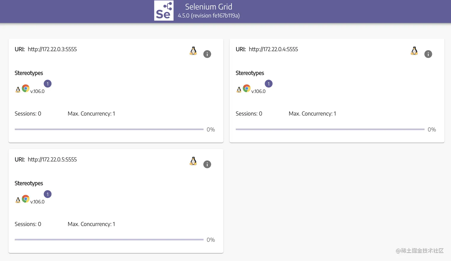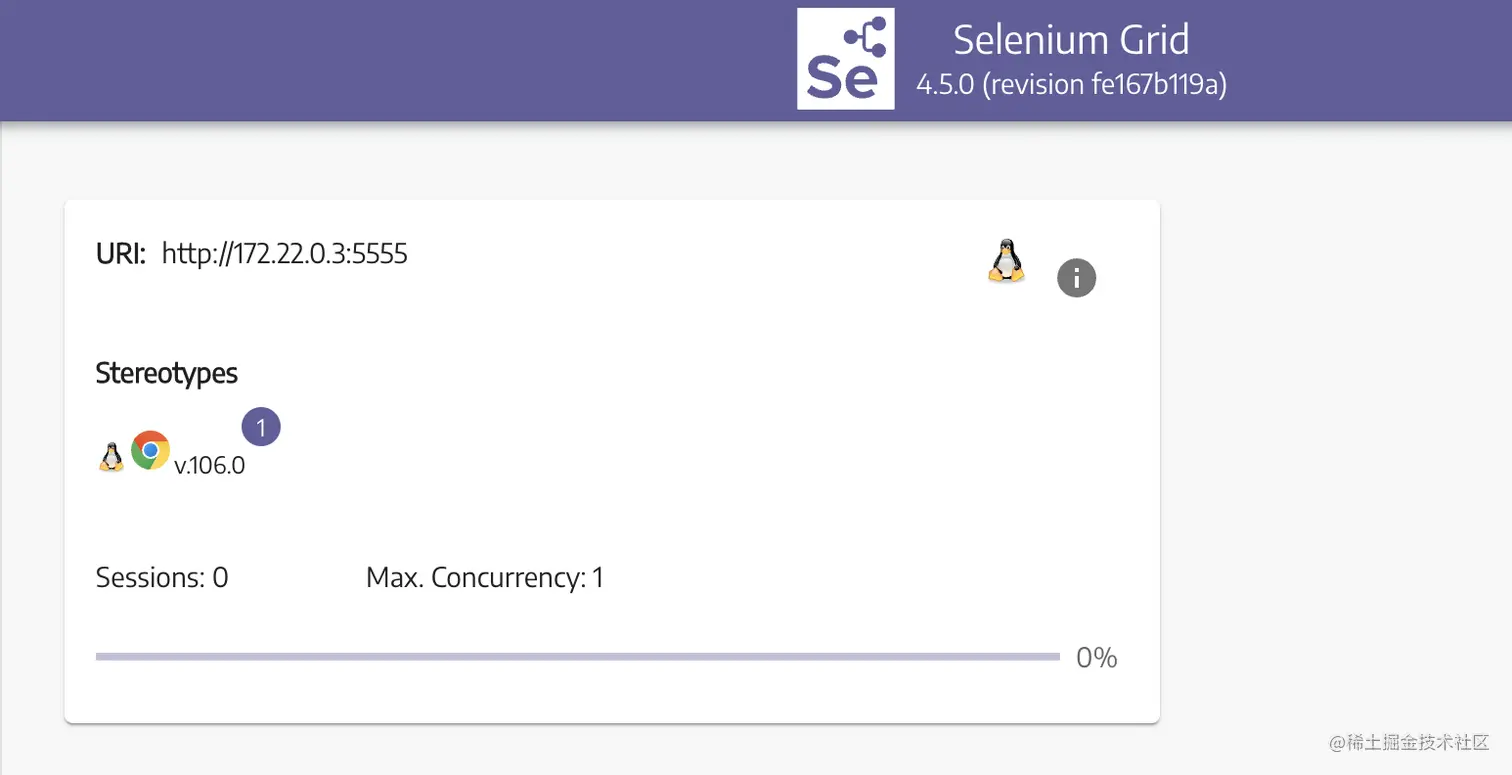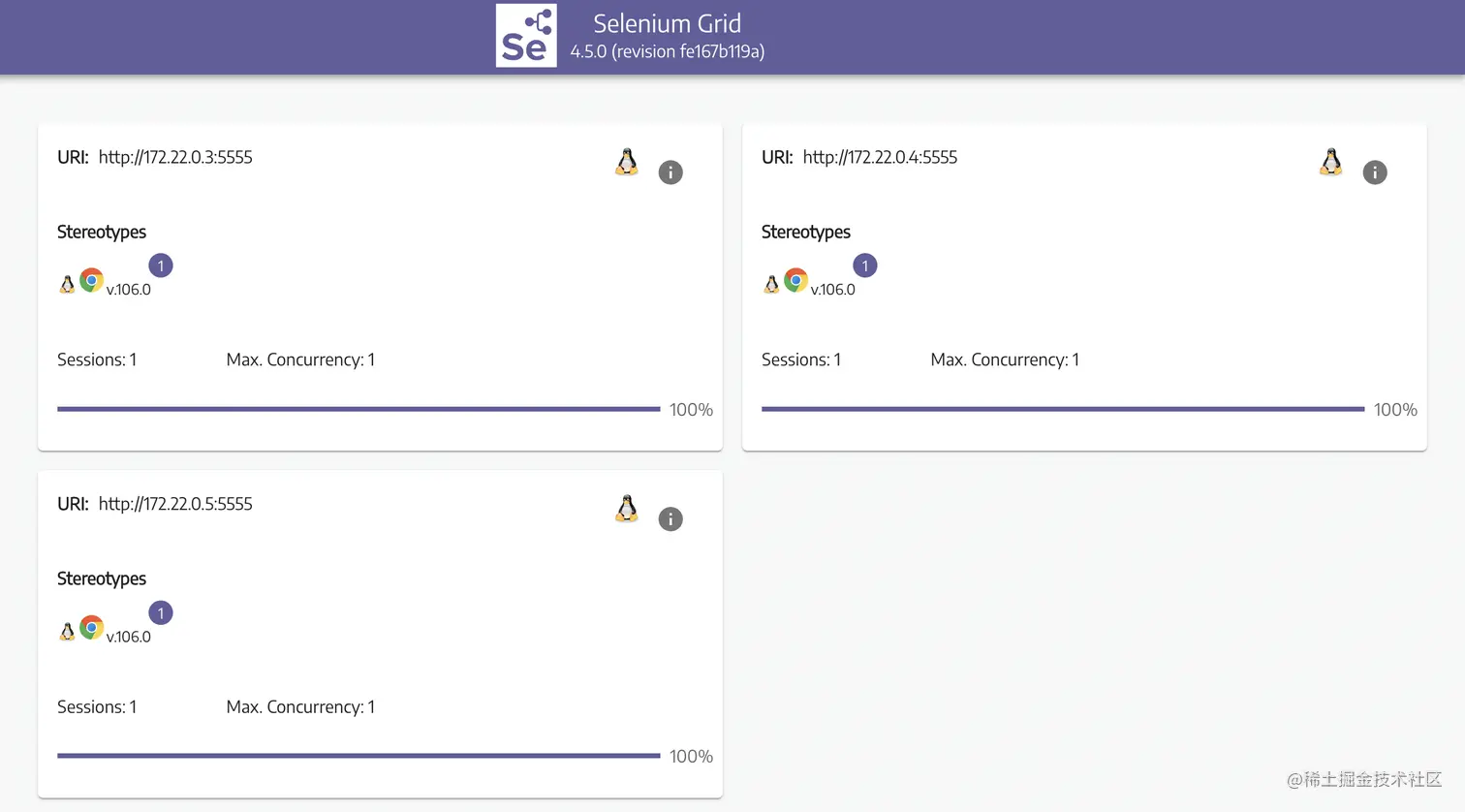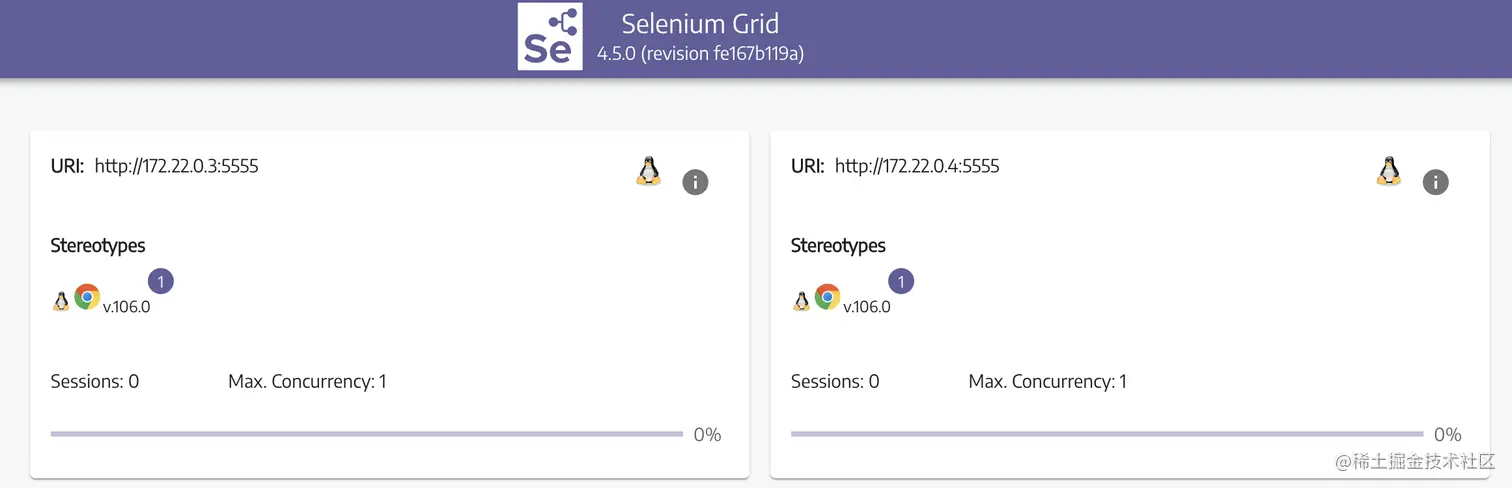 docker run -d --net grid -e SE_EVENT_BUS_HOST=hub --shm-size=2g -e SE_EVENT_BUS_PUBLISH_PORT=4442 -e SE_EVENT_BUS_SUBSCRIBE_PORT=4443 --name chrome2 selenium/node-chrome可以再启动一个节点。在浏览器上再次访问http://服务器IP:5444,可以看到一个新节点已经注册成功,并且操作系统为Linux。
