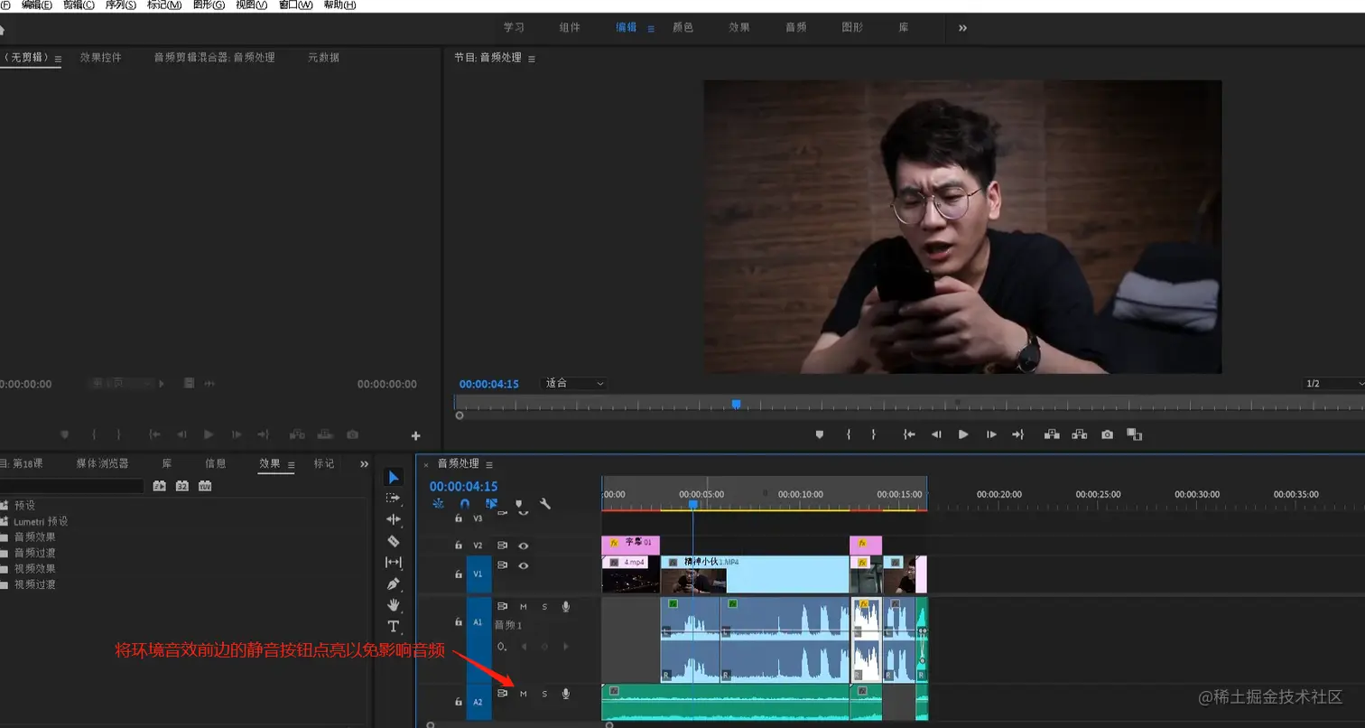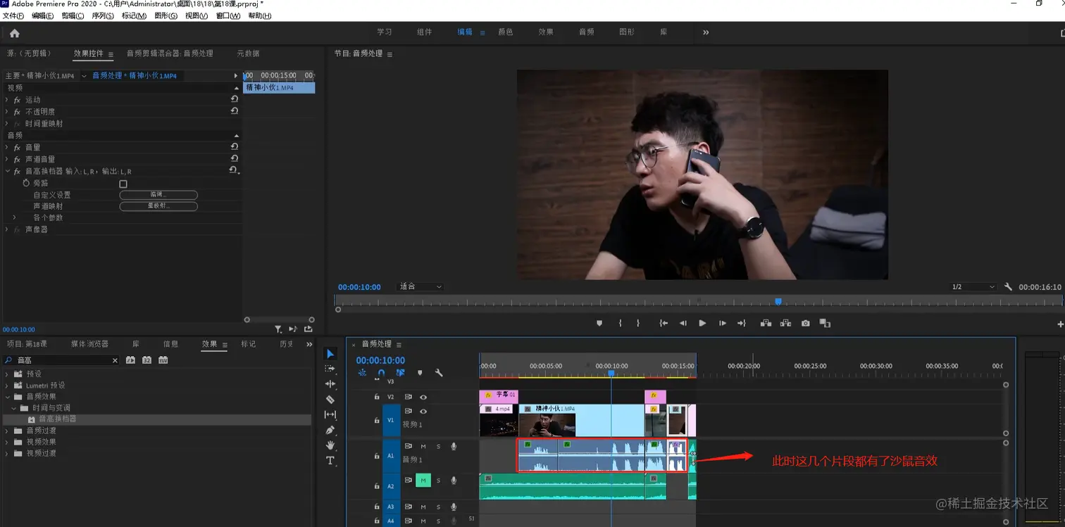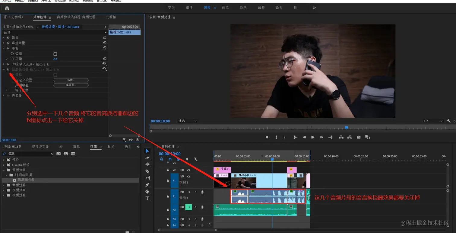 - 分别选中刚才我们添加音高换挡器效果的那几个音频,在效果控件下将他的音高换挡器效果前边的fx图标关掉。
