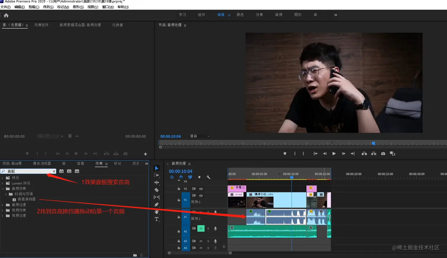 - 在效果面板搜索音高二字,将音高换挡器拖给第一段音频