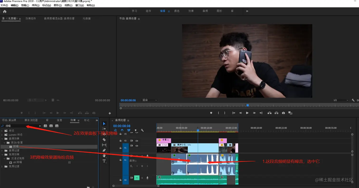 - 这时此段音频有明显的噪音,选中它,在效果面板搜索